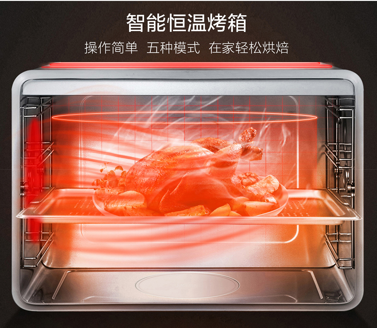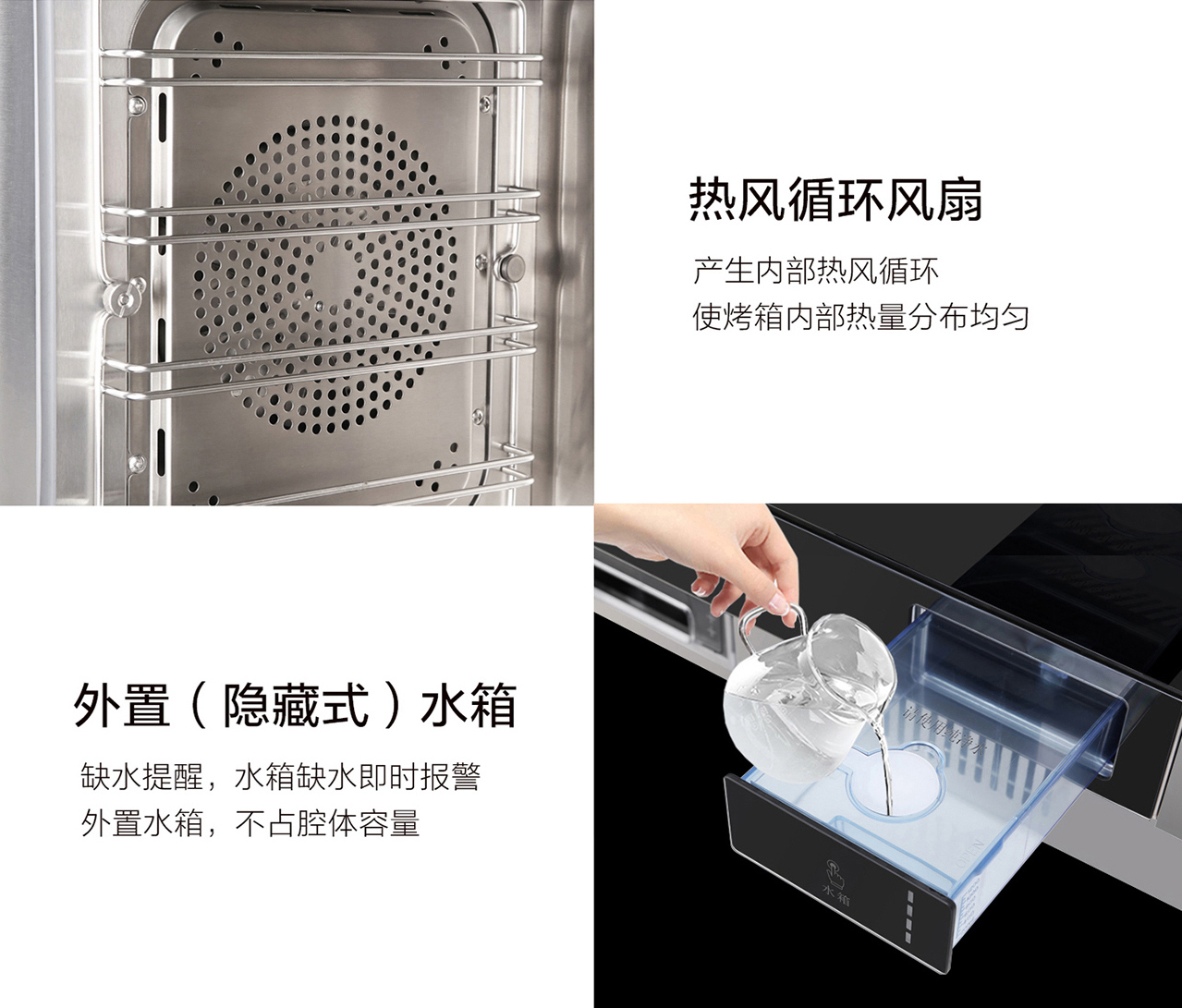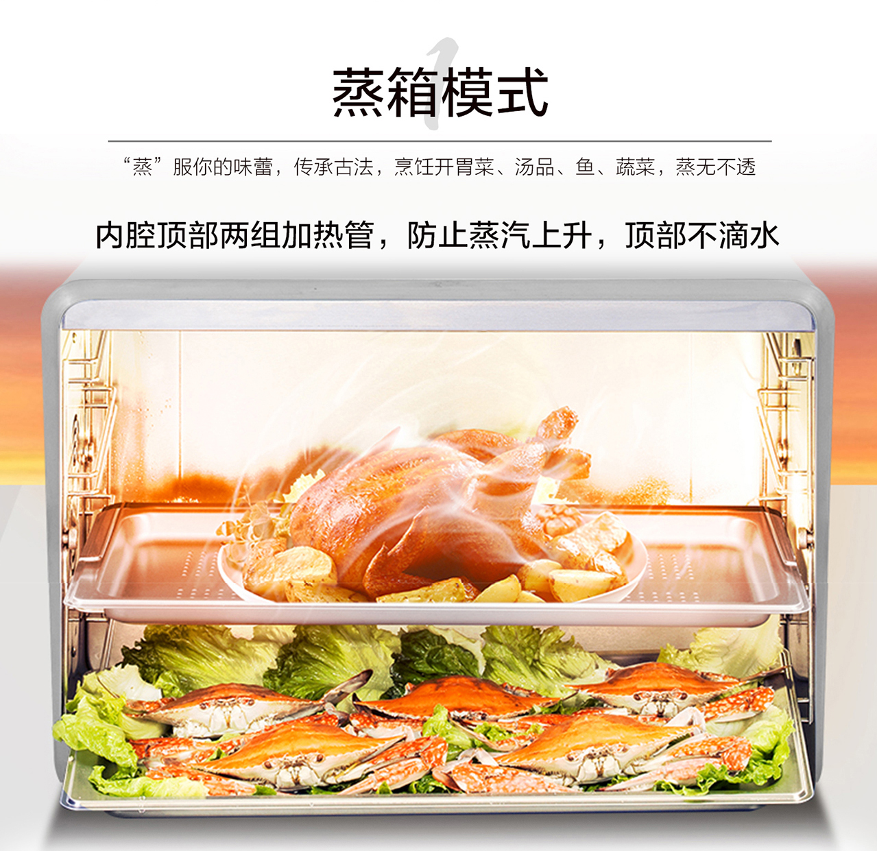 • 62L大容量食品級304不銹鋼內膽,上下4層設計,9種蒸烤模式。