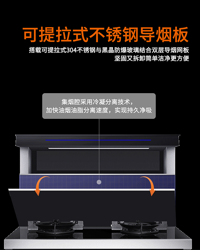 - 集煙腔采用冷凝分離技術,加快油煙分離速度,實現持久凈吸。