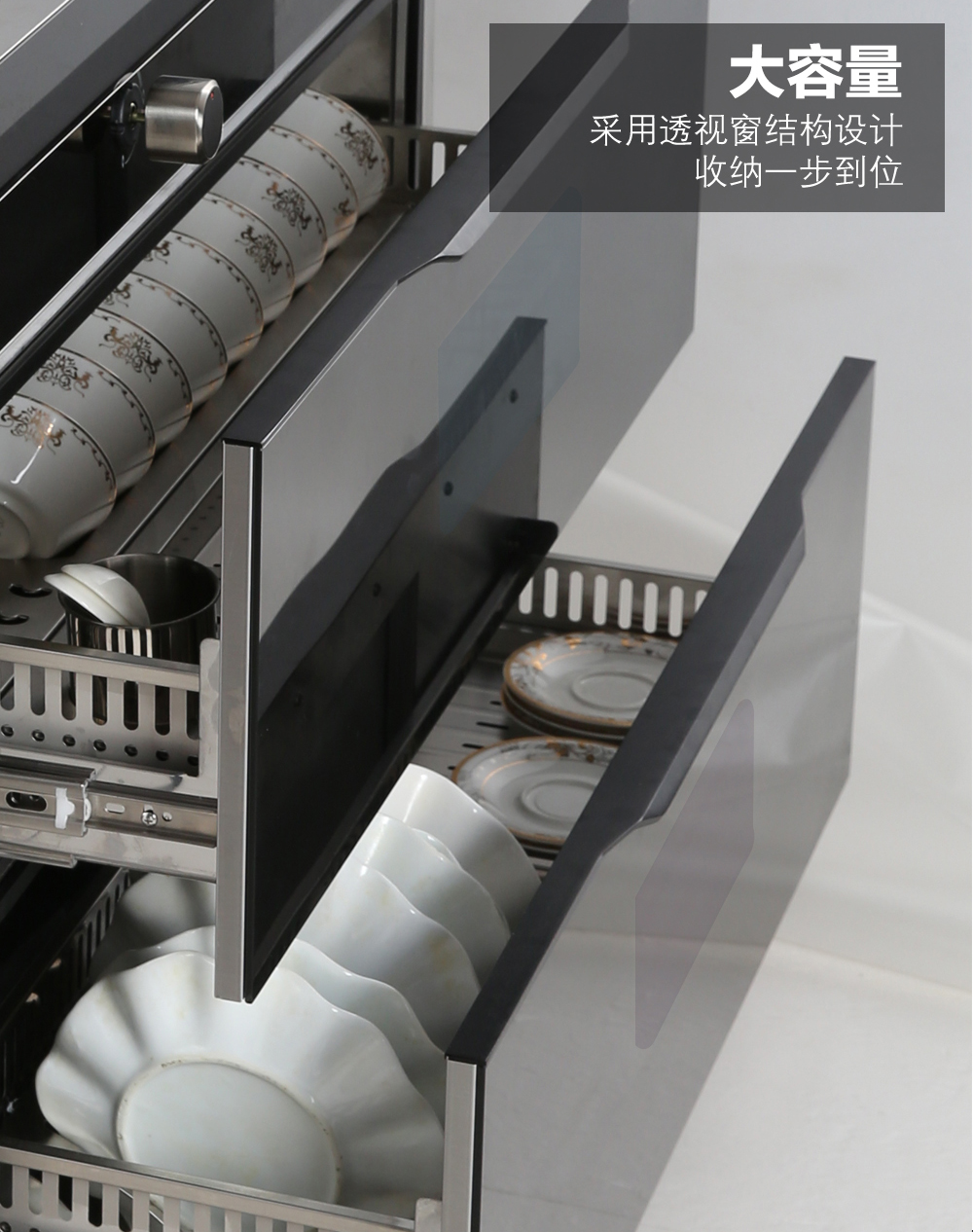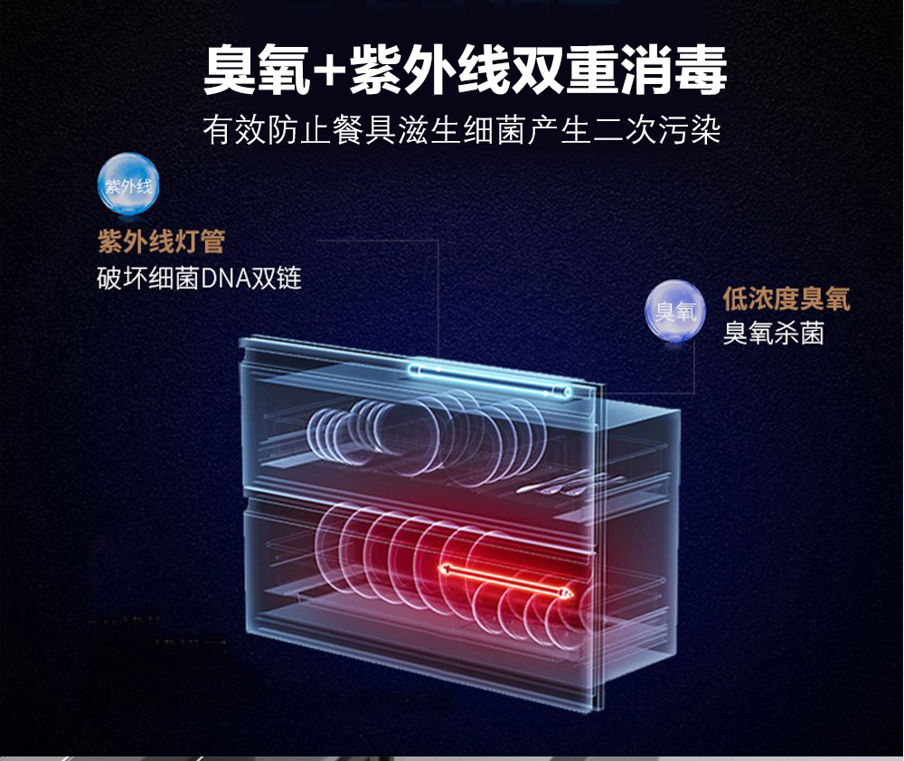 • 臭氧+紫外線雙重消毒設計,有效防止餐具滋生細菌產生二次污染等風險