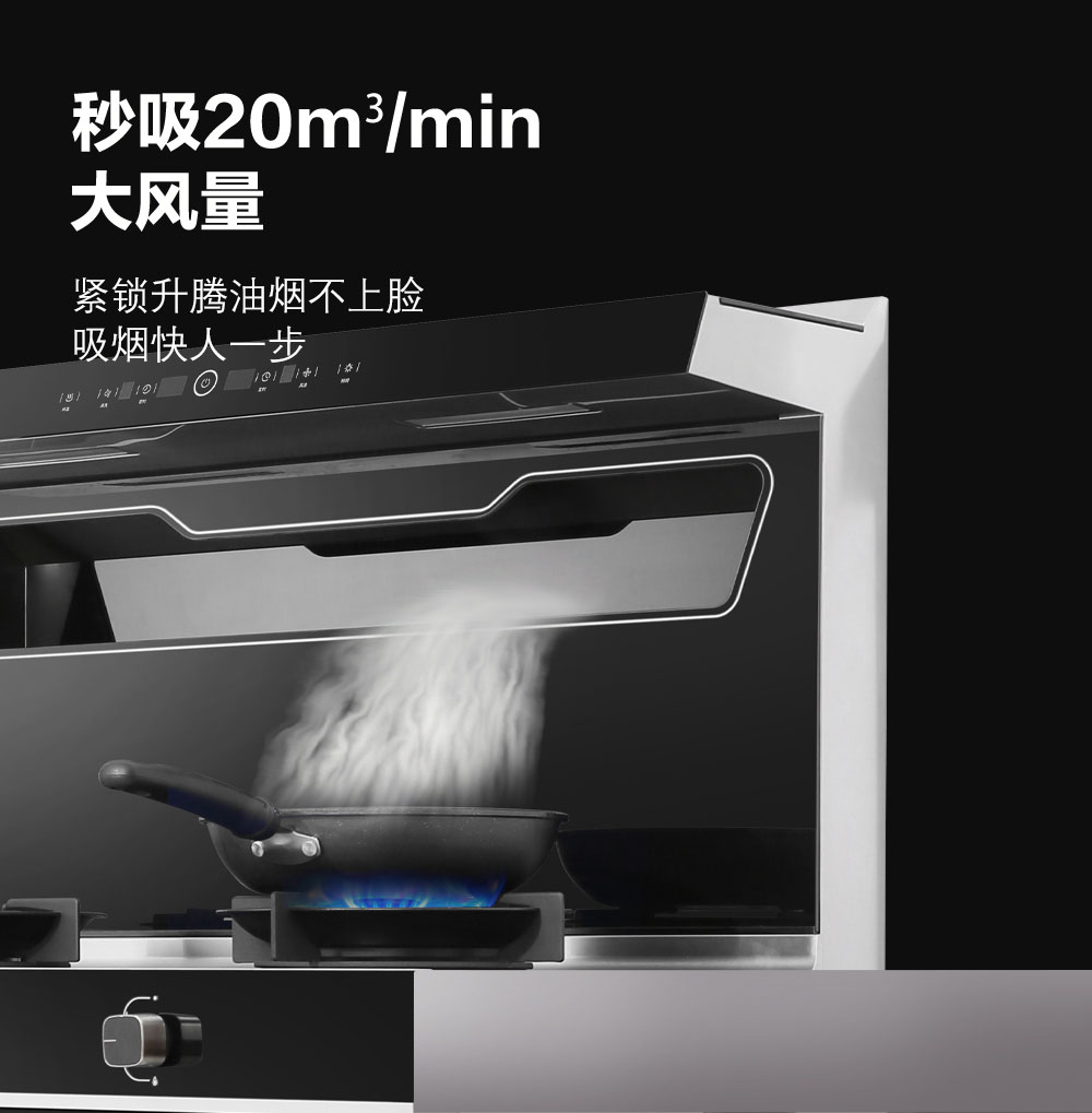 • 低空近吸技術,緊鎖升騰油煙不上臉,吸煙快人一步,油煙無處可逃