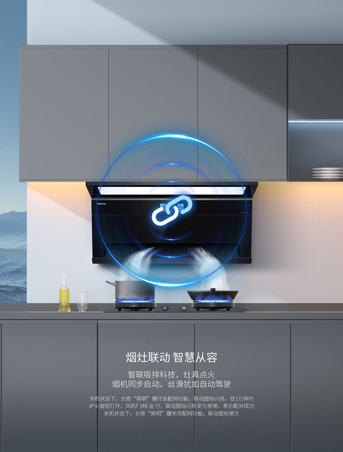 - 風(fēng)隨火啟,煙灶聯(lián)動(dòng)智慧從容,智聯(lián)吸排科技