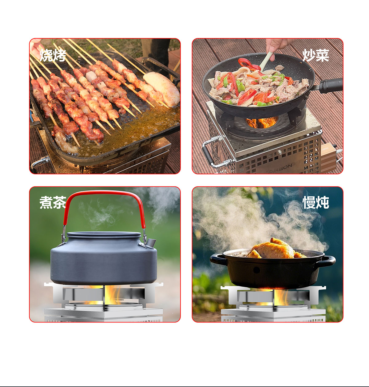 • 飛檐式防滑鍋架,堅固耐用,聚熱安全